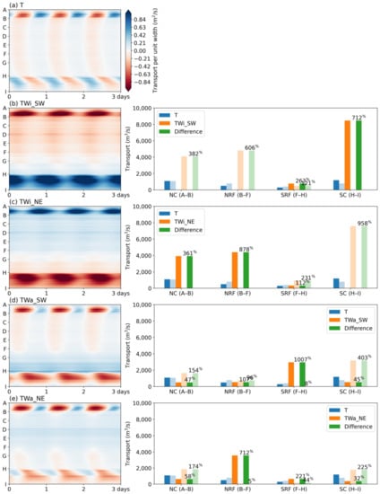 In the baseline experiment T, the transport across the lagoon edge exhibited a regular switch pattern of inflows and outflows due to tides (Figure 5a). The water flew in and out repeatedly at every location of the lagoon edge. The tidal flows at north channel, south channel, and reef flat were asynchronous; water along the lagoon edge did not flow into or out of the lagoon simultaneously. This was probably due to the fact that the tidal waves came from the east; thus, the tidal phases at different locations of the Dongsha Atoll were not the same. A detailed study of this feature is beyond the scope of this manuscript and is left for future work. In the experiment TWi_SW, which represents the typical summer monsoon in this area, the effects of southwestern wind were superimposed on the regular tidal pattern (Figure 5b). The south channel (H–I) and southern reef flat (F–H) exhibited great increases in inflows compared to the experiment T (717% and 263% of the experiment T inflow transports, respectively), and the north channel (A–B) and northern reef flat (B–F) exhibited great increases of outflows (382% and 606% of the experiment T outflow transports, respectively). On the contrary, the experiment TWi_NE suggested that northeastern wind (the winter monsoon) enhanced outflow transports at the south channel and the southern reef flat, and enhanced inflow transports at the north channel and the northern reef flat. The influences of the southwestern and northeastern winds were opposite. Since wind stresses over the sea surface drag water to form the currents along the wind directions, the southwestern wind enhanced transports into the lagoon through the southwestern atoll. On the other hand, it enhanced transports out of the lagoon through the northeastern atoll occur along with the southwestern wind. The reversed directions of the wind-influenced transports occurred for the northeastern wind. It is tricky to determine whether inflow or outflow transports were enhanced at the north channel by the two principal monsoon wind directions because the cross-section orientation of the north channel was roughly southwest–northeast. Instead of being directly influenced by the wind, the transports at the north channel were considered as the compensation for the excess transports through the south channel and the reef flat.