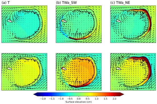 In Figure 6, the instantaneous surface elevation distributions of the experiments T, TWa_SW, and TWa_NE are shown to illustrate the wave-induced transports. With the tide forcing only, the reef flat all exhibited inflows in the flooding phase and outflows in the ebbing phase (Figure 6a). When the incident waves from the open ocean broke at the fore reef, wave setup was generated at the reef flat, shown by the red patches at the reef flats in Figure 6b,c. The incident directions of the waves determined where the wave setup occurred at the reef flats. The waves from the southeast induced wave setup at the southern reef flat (Figure 6b) and those from the northeast induced wave setup at the northern and eastern reef flat (Figure 6c). This wave setup provided pressure gradient favoring inflows across the reef flat. The enhanced wave-induced reef flat inflows led to enhanced channel outflows. For example, the outflows at the south channel were enhanced because of the enhanced inflows at the southern reef flat (Figure 6a,b). Furthermore, the wave-induced inflows at the southern reef flat seemed to correlate with the outflows at the south channel more than the wave-induced inflows at the north/eastern reef flat did. For example, the resulting south channel outflow transports were greater in TWa_SW than those in TWa_NE (see the flow vectors in Figure 6b,c and the outflow differences at H–I in Figure 5d (403%) and 5e (225%)). Proximity of the south channel and the southern reef flat may be attributed to the tight correlation between the wave-induced southern inflows and the south channel outflows.