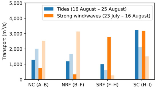 Returning to the realistic scenario, the inflow and outflow transports integrated over the north channel, the northern reef flat, the southern reef flat, and the south channel are shown in Figure 7. In order to distinguish the effects by wind/waves and tides, the transports were calculated separately in two periods, 23 July–16 August (strong southwestern wind and waves) and 16 August–25 August (wind and waves were calm; tides dominated). The transport pattern in the tide-dominated period was similar to the baseline experiment T, in that switching of inflows and outflows were relatively homogeneous over the reef flat (Figure 4a and Figure 5a). As the wind and waves effects were introduced to the system during 23 July–16 August, the tidal pattern was superimposed by the intensified outflow transports at the northern reef flat and inflow transports at the southern reef flat, which was consistent with the experiments TWi_SW and TWa_SW. The southwestern wind and waves also intensified the outflow transports at the north channel. At the south channel, the inflow and outflow transports in the tide-dominant and wind–wave-dominated periods were similar. Wind and waves did not seem to modify the flow pattern at the south channel. The reason may be that, according to the experiments TWi_SW and TWa_SW, the former exhibited an intensified inflow transport at the south channel, and the latter exhibited an intensified outflow transport. Thus, the inflow and outflow transports compensated for each other, such that the south channel transports in the two periods in Figure 7 are similar.