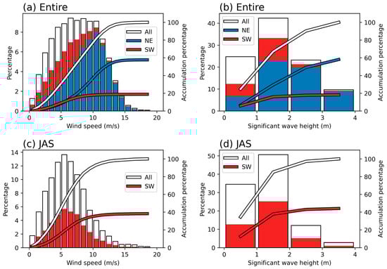 Histograms of (a,c) wind speed and (b,d) significant wave height (combined wind waves and swells) during the period 1959 to 2021 (data source: ERA5, daily). Panels (a,b) were derived from the entire data, and panels (c,d) were derived from the data in July, August, and September (JAS). The lines denote accumulation percentages.