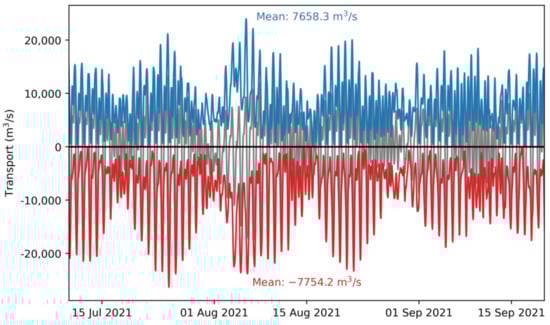 A most intuitive timescale is how much time it takes for the whole volume of the waterbody to be totally renewed by the inflow or outflow water transports. The so-called flushing time is the lagoon volume divided by the inflow transport. Since the inflow transport exhibits tidal variation (Figure 9), the mean value of 7568 was used to divide the lagoon volume (). Thus, the flushing time of the system was about 4.7 days.