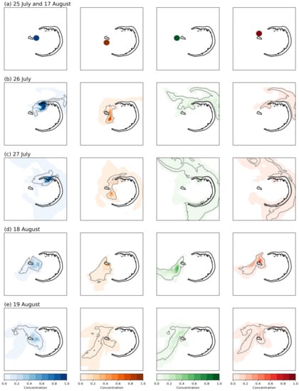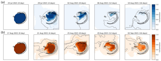 Depth-averaged concentrations over time (from left to right). They were released on (a) 25 July, in the wind–wave-dominated period, and (b) 17 August, in the tide-dominated period. The gray contours indicate 37% () and 1% of the initially released concentration.