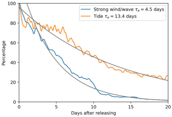 To calculate the e-folding flushing time, I numerically released tracers with the initial concentration of 1 throughout the water body of the control volume, which was enclosed by the closed curve from A to H shown in Figure 1c. The maps of depth-averaged concentrations are shown in Figure 10. The tracers were released separately in the period of the wind–wave-dominated condition (25 July; Figure 10a) and tide-dominated condition (17 August; Figure 10b) to distinguish the effects of wind/waves and tides. Under the strong wind and waves, the tracer released on 25 July diffused more quickly than that released on 17 August (Figure 10). After 16 days of releasing, there were no concentrations higher than 37% () in the lagoon for the tracer released in the wind–wave-dominated period, but there were concentrations higher than 37% in the lagoon for the tracer released in the tide-dominated period. This suggests that the wind and waves had greater capability to drive the water exchange. The mechanisms of wind and waves driving water exchange were demonstrated in the numerical experiments in the previous section. By integrating the material concentrations over the whole lagoon volume, the time series of the total material volume of the two tracers are shown in Figure 11. The concentrations decreased approximately according to exponential decay; thus, the e-folding flushing time in Equation (3) was estimated by fitting the exponential decay to the time series of total material volume. The fitting suggests that the system driven by the wind–wave-dominated condition has a shorter e-folding flushing time (4.5 days) than the system driven by the tide-dominated condition (13.4 days). The e-folding flushing time represents a timescale for intercomparisons, i.e., for comparing the flushing rate in different sea conditions or different study sites. It can reveal a general timescale of the flushing rate, but it does not practically state how long the materials, for example, pollutants, nutrients, or dissolved chemicals, in the lagoon take to be expelled. To directly estimate the time which materials take to travel within the lagoon, methods of the Lagrangian perspective are required.