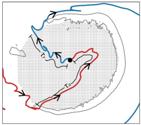 A schematic plot which illustrates the concept of residence time () and age ( ). Taking a water parcel at the black dot as an example (the arrows indicate traveling directions), it comes from the open ocean in the path of the red curve and goes outside the lagoon in the path of the blue curve. Therefore, age is the duration of the path marked by , and residence time is the duration of the path marked by . The gray dots represent the passive numerical floats released for calculating residence time and age.