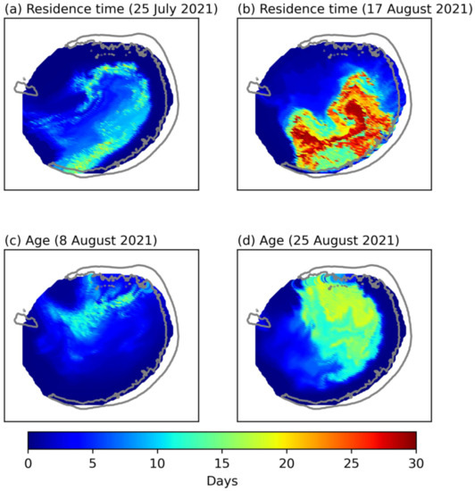 Spatial distributions of the residence time calculated with the forward tracking floats released on (a) 25 July and (b) 17 August (see the orange triangles in Figure 4a) and age calculated with the backward tracking floats released on (c) 8 August and (d) 25 August (see the green triangles in Figure 4a).