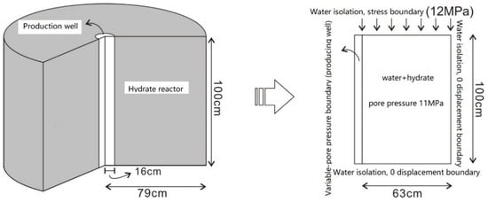The initial pore pressure of the model was 11 MPa, and the sides and top were watertight boundaries where no material exchange could occur with the outside boundaries (Table 1). The left side was a variable pore pressure boundary condition, where the pore pressure values were obtained by the interpolation of the measured pore pressure. The left side of the model corresponded to the location of the production well, and the production well pressure was reduced in two stages: 0–2.5 min from 11 MPa to 3.4 MPa; the second stage of production pressure was reduced slowly from 3.4 MPa to 0.1 MPa at atm. The top side of the model had a stress boundary of 12 MPa, and the right side and bottom side were set to a zero displacement boundary due to the constraints of the reactor wall. The mechanical boundary conditions on the left side were simplified to a free displacement boundary. The initial pore ratio in the model was 0.67 based on the porosity conversion, the permeability was 10 × 10−13 mD, and the hydrate saturation was 46%. The initial moment of the model simulation corresponded to the moment when the sediment was consolidated at 12 MPa at the top and ready to open the valve at the bottom to start mining.