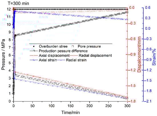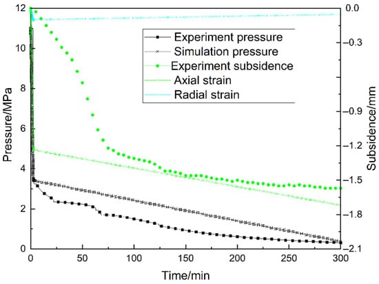 As shown in Figure 4, the pore pressure P of the numerical simulation was consistent with the pore pressure variation pattern during the experimental mining process, which was consistent with the two main stages of the model assumptions. The axial displacement of the numerical simulation was related to the pressure. However, the subsidence caused by changes in permeability and fluid properties during the extraction process could not be characterized yet, which affected the fitting results. The axial displacement U2 at the beginning of the pressure drop was larger, but the gradually slow subsidence during the extraction process could not be characterized. Finally, the total subsidence was still similar. Therefore, the effect of settlement during gas hydrate exploitation was influenced not only by changes in stress but also by other factors that need to be explored. As shown in Figure 5 and Figure 6, the stress variation, pore pressure, radial strain, and axial strain during the buckling process were simulated based on the intrinsic model of the gas hydrate exploitation process. The total reduction in radial displacement was considered to be the volume loss of the reservoir, i.e., the volume of sand released. Both the axial strain and axial displacement were expressed as the downward movement by overburden stress. It is noteworthy that the radial strain was deformed to the right during the extraction process, away from the wellbore, while the radial displacement was displaced to the left during the extraction process, close to the wellbore. We assumed that under the overburden stress, the right wall was a non-displaced rigid body and that the radial strain was manifested as the shear contraction phenomenon in the South China Sea gas hydrate mechanics model, but the radial displacement of the reservoir was characterized as displacement towards the wellbore.
