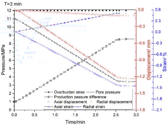 The radial displacements of the model were on the order of 10−6 mm (Figure 3b). The strains after stress equilibration were extremely small. The radial strains (Figure 3c) and axial strains (Figure 3d) were loaded by the overlying stresses, which varied more regularly and both showed an order of 10−7 mm. The pore pressure was 11 MPa (Figure 3e), which was consistent with the experimental tests. The vertical and radial displacements of the model met the ABAQUS’s requirements for initial stress balance, and this state could be used as the initial state for hydrate extraction.