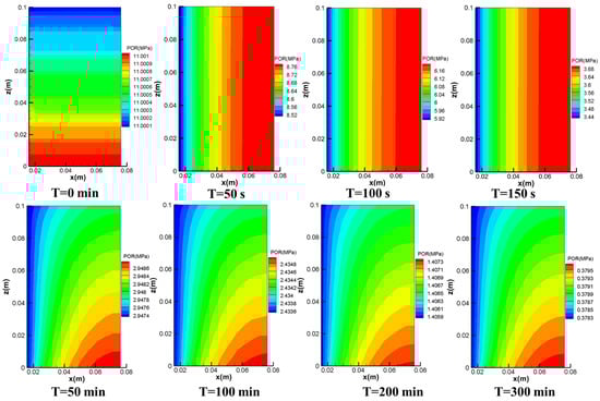 Figure 7 shows the spatial distribution of pressure during the extraction process. The original formation pressure showed a more uniform axial distribution, while the pressure changed to a more uniform radial distribution during the opening minutes of the well dewatering. The pore pressure decreased from an initial 11 MPa to 8.64 MPa, 6.04 MPa, and 3.56 MPa at 50 s, 100 s, and 150 s, respectively. The pressure drop was large, but the radial pressure difference within the reservoir was 0.2 MPa. Thus, during the first stage of production, the pressure near the wellbore was low, and the pressure away from the wellbore was high, showing a radially uniform pressure gradient. The distribution of the pressure gradient was radially uniform. However, as production progressed, the pressure dropped to 2.945 MPa, 2.4342 MPa, 1.4067 MPa, and 0.3789 MPa at 50 min, 100 min, 200 min, and 300 min, respectively, and the pressure difference within the reservoir decreased to 0.12 MPa, showing a non-uniform pressure gradient distribution. In the radial direction, the pressure was higher away from the wellbore; in the axial direction, the pressure gradient distribution showed the influence by the overlying stress. Thus, in the second and third stages of production, the pressure distribution in the reservoir was mainly influenced by the gas pressure, while the pressure differential was mainly due to the different permeability of the reservoir. During these two stages of production, the combined effect of overburden stress loading and the gravity of the overlying sand, the lower sediment of the reservoir was gradually compacted, resulting in lower sediment porosity and the permeability being lower than that of the upper sediment of the reservoir, further resulting in higher pressure in the lower reservoir than the upper. On this basis, the radial depressurization gradient was gradually deflected by compaction, showing the lowest pressure in the upper reservoir near the borehole wall and the highest pressure in the lower reservoir away from the borehole wall. No further change in the pressure gradient was observed during the continuous pressure drop.