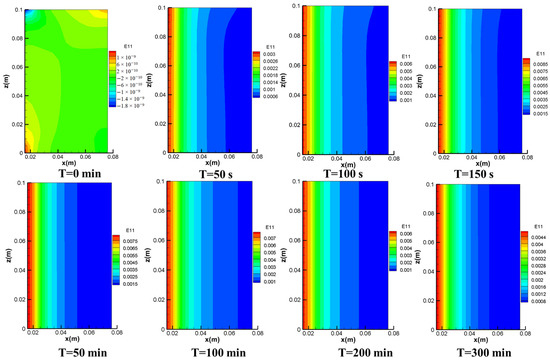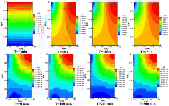 Figure 8 shows the spatial distribution of radial strains during the extraction process. The radial strains in the original formation showed a relatively uniform distribution, with a strain of −2 × 10−10. The whole reservoir formation showed increasing strain away from the wellbore, and formation near the wellbore showed increasing strain to the right. The strain near the wellbore at 50 s, 100 s, and 150 s varied from 0.003, 0.006, and 0.0085, respectively, away from the wellbore to 0.0006, 0.001, and 0.0015, respectively, at the boundary, and the strain difference between the wellbore and the boundary increased from 0.0024, 0.005, and 0.007, respectively, indicating that the strain was gradually concentrated in the interior of the reservoir. Thus, during the first stage of production, the rapid depressurization due to drainage and the shearing of the reservoir due to the pressure drop resulted in a more pronounced change in the radial strain. It is worth noting that the smaller points of radial strain in the initial formation had an effect on the radial strain distribution during the first stage of mining, where the radial strain at the upper part of the boundary was smaller, resulting in a deflection of the radial strain in the upper part, which gradually became smaller as mining progressed. As mining progressed, the radial strains at 50 min, 100 min, 200 min, and 300 min were 0.0045, 0.004, 0.004, and 0.0028, respectively, showing a more uniform strain gradient distribution with less overall variation. Therefore, during the second and third stages of production, the radial strain in the reservoir was low during the process of gas production and pressure reduction.