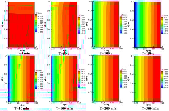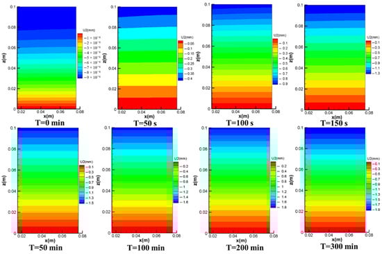 Figure 11 shows the spatial distribution of the axial displacement of the pressure during the extraction process. The axial displacement of the original formation showed a relatively uniform distribution, with a displacement of −5 × 10−6 mm. The whole axial displacement showed a downward displacement under the overlying stress. At 50 s, 100 s, and 150 s, the top axial displacement was −0.4 mm, −0.9 mm, and −0.1 mm, respectively, with the axial displacement differential between the layers and the axial displacement near the borehole wall being slightly larger. Thus, during the first phase of production, the axial displacement of the reservoir resulted in the settlement of the reservoir due to pressure drop. As production progressed, the top axial displacement settled slowly at −1.5 mm, −1.6 mm, −1.8 mm, and −1.9 mm at 50 min, 100 min, 200 min, and 300 min, respectively, with a little overall variation. The axial displacement gradient was evenly distributed, but the difference between layers was large and increasing, with the largest axial displacement at the top of the sediment and the smallest axial displacement at the bottom. This was mainly due to the overburden stress on the bottom sediment and the compaction of the upper sediment, resulting in a smaller axial displacement of the bottom sediment. The top sediment, conversely, was subject to overburden stress and sand exit gap, which further compacted the top sediment, resulting in a larger axial displacement. Therefore, in the second and third stages of production, the axial displacement of the reservoir decreased steadily and slowly during the process of gas production and pressure reduction.