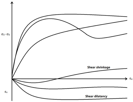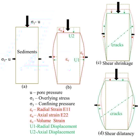 From previous studies on the mechanical response of HBS [30,31,32,33,34,35,36,37], the typical sample deformation and stress-strain curves of HBS in tri-axial are shown in Figure 12 and Figure 13. The shear shrinkage (Figure 12c) and dilatancy (Figure 12d) are two typical deformations in the rock and soil tri-axial tests. Most gas and oil wells show shear dilatancy in rock; the mechanical failure of rock means sand production, which is widely applied to principles of sanding in conventional petroleum wells. However, the unconsolidated or weakly consolidated HBS during depressurization shows shear shrinkage, which could show the different sanding behaviour and sand prediction model. Because of the weak strength of HBS, the mechanical failure model for sanding is difficult for determining the sand production of HBS.