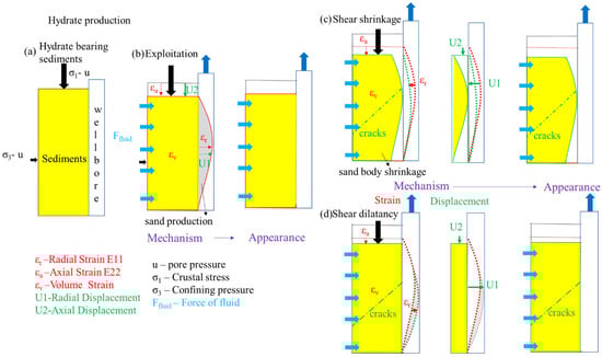 The sand production behaviour of HBS is different in the three GH production periods [20,38,39,40]. For the wellbore in the gas hydrate reservoir (Figure 14a), the HBS showed the shear dilatancy and moved into the wellbore (sand production) in the first period of GH production by gas/water fluid (Figure 14b). In the first period, the sanding of HBS was contributed by the HBS dilatancy force (mechanical field) and the gas fluid driving force (hydraulic field) together. In the second period of GH production by high flow rates of gas fluid carrying water (Figure 14c), the HBS showed the shear shrinkage and moved away from the wellbore, meaning that the HBS shrinkage drawing force (mechanical field) resisted the gas fluid driving force (hydraulic field). In the third period of GH production by the low-flow rate gas fluid but high-pressure differential (high effective stress), the HBS showed the shear dilatancy and moved into the wellbore again (Figure 14d), while fluid driving force may have been low due to mud-cake formation by the HBS filtration properties and wall building [40,41]. Above, the sanding behaviours were dominated by different mechanical (M)–hydraulic (H) components, which were the M+H, M-H, and M in the first, second, and third periods of GH production, respectively.