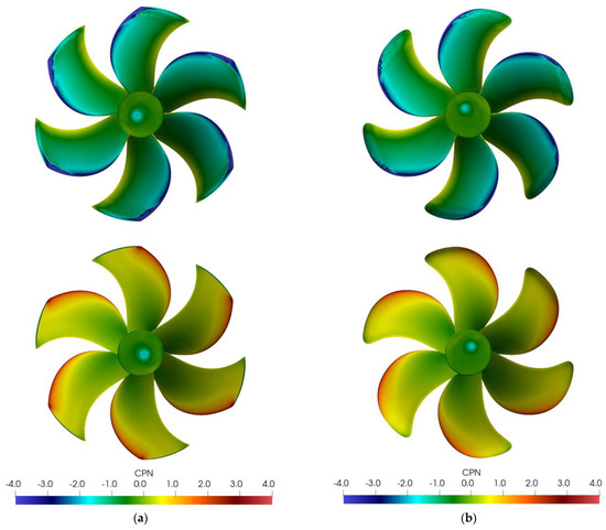 Pressure distributions (CPN) on the pressure and suction side of the propellers. Advance coefficient J equal to 0.9 (design point). Instantaneous snapshot after 22 propeller revolutions. (a) Conventional CLT; (b) New generation CLT.