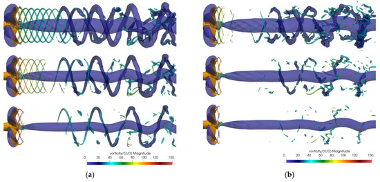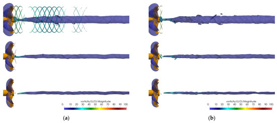 Isosurface of Q (5000 s−2 superimposed to Q = 50,000 s−2) at the loaded condition (J = 0.6). General overview. (a) Conventional CLT propeller; (b) New generation CLT propeller.