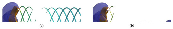 Isosurface of Q (5000 s−2 superimposed to Q = 50,000 s−2) at the design advance coefficient (J = 0.9). General overview. (a) Conventional CLT propeller; (b) New generation CLT propeller.