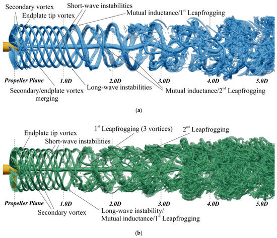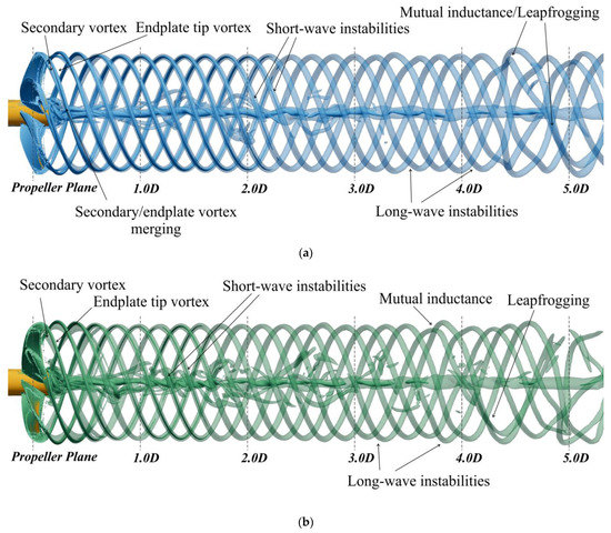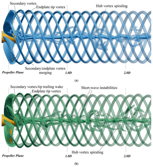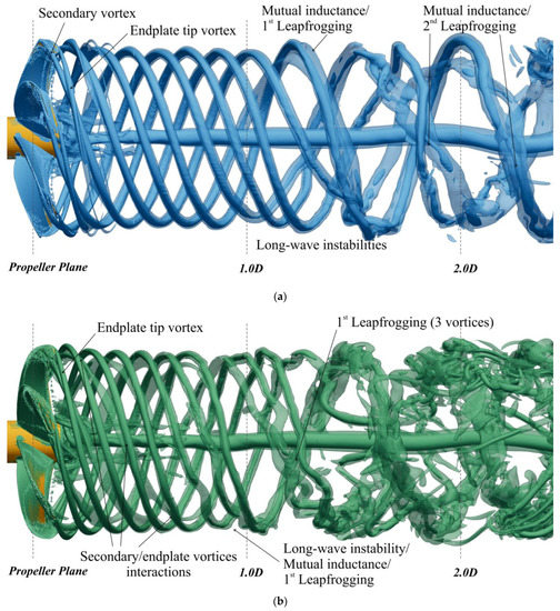 The typical occurrence of short waves, long waves and mutual inductance [51,52] as precursor to the destabilization of tip vortices can be appreciated too for both geometries. Short waves instability, also as a consequence of the not yet sufficient grid resolution, are barely visible as the small oscillations of the helical vortex occurring approximately between 1.5 and 2.0D from the propeller plane. Long waves are, instead, well distinguishable. Their occurrence, between 2 and 3 complete revolutions (about 3.0D aft the propeller), trigger a mutual inductance instability that rapidly leads to leapfrogging [46,51] and further merging of the vortices in the wake.