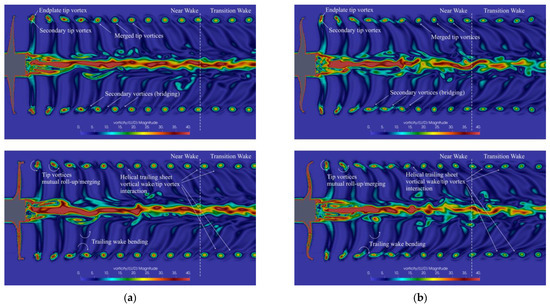Longitudinal distribution of vorticity (magnitude) at time t (top) and t + 80 deg. (bottom). Design advance coefficient (J = 0.9). (a) Conventional CLT propeller; (b) New generation CLT propeller.
