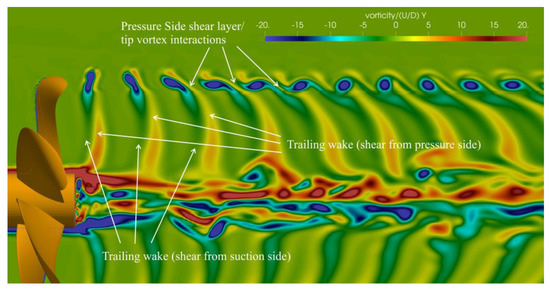 Longitudinal distribution of vorticity (ωy). New generation CLT propeller at the design advance coefficient (J = 0.9).
