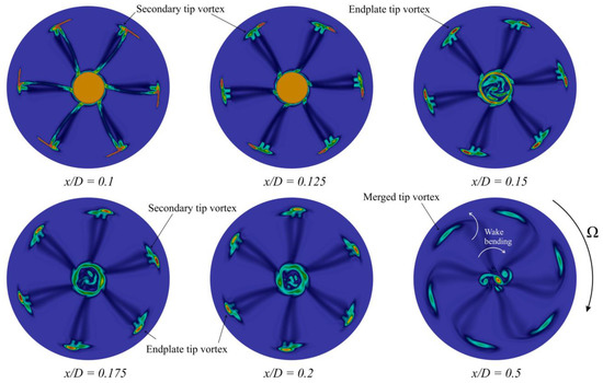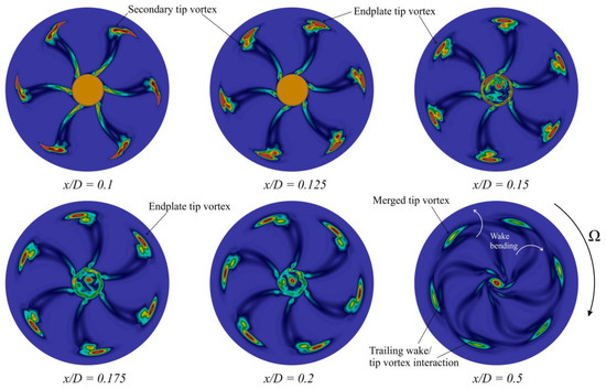 Short-wave instabilities in the case of the new generation CLT seem, instead, clearly induced by the interactions with the secondary vortex/trailing wake of the blade at tip. As described in [41] for the conventional E779A propeller under heavy loading condition, the short-wave instabilities of the endplate tip vortex occur after its interaction with the secondary vortex/helical trailing wake detached by the subsequent blades, which sometimes, after detaching from their parent tip vortices, seems to “skip” the interaction with the next ones. This is exactly observed for this tip-loaded propeller where the secondary tip vortices, “moving” downstream with a much higher pitch, influence the endplate tip vortices of at least two previous blades.