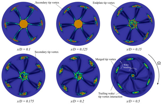 Transverse distributions of vorticity (magnitude) at different axial locations downstream the propeller. New generation CLT propeller at the design advance coefficient (J = 0.9).