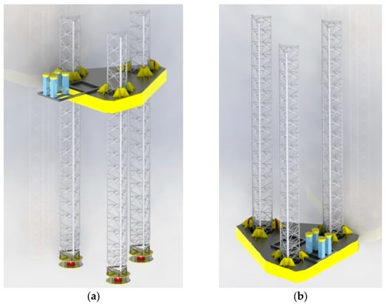 Conceptual design of the in-house developed generic self-elevating unit: (a) elevated condition, (b) transit condition.
