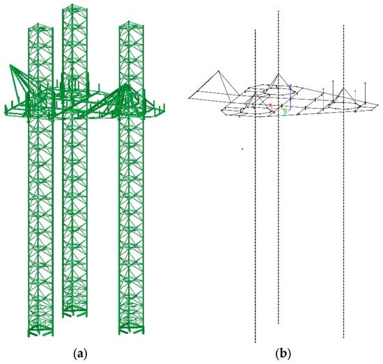 The full-order FE model of the generic SEU is shown in Figure 3a. The truss legs are modeled in detail with two-node linear beam elements. The legs consist of all structural members such as chords, horizontal, diagonal, and internal braces. The hull is simplified by zero-mass dummy beams with a very large Young’s modulus to maintain rigidity. The mass and mass distribution of the hull and equipment are modeled by point mass at their corresponding center of gravity. The final mass properties of the model are carefully checked by comparing them with the initial design. The connections between legs and hull are modeled as linear springs in the present model, which are simplified from the non-linear prototype design. The spudcan constraints are simulated as pin boundary conditions. Rotational springs are introduced in the rotational directions, namely Rx, Ry, and Rz. The rotational stiffness value is 42,360 Nm/rad for Rx and Ry and 4236 Nm/rad for Rz. The model has 1807 nodes and 10,842 degrees of freedom.