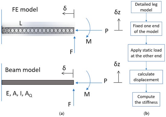 Procedure for deriving equivalent stick model for SEUs: (a) application of forces for deriving equivalent stiffness, (b) flowchart for deriving equivalent stiffness.