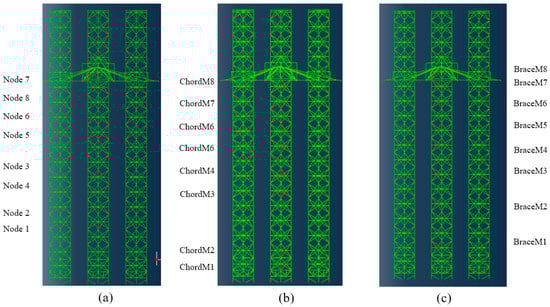 Location of (a) selected nodes, (b) chord members, and (c) bracing members on forward legs of the SEU for validation comparison (ChordM1 stands for chord member 1, BraceM1 stands for bracing member 1).