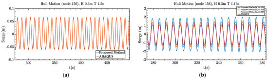 The hull motion responses under regular wave excitations outside the resonant range and at the resonant frequency are shown in Figure 7a,b, respectively. The hull motion is taken from the geometrical center of the hull on the deck that is denoted as node 156 of the full FE model. Only surge motions are presented because they are the governing motions for the SEU under head sea conditions. It can be found that when the wave excitation is outside the resonant frequency range of the SEU, the proposed method provides very close results to those of the full-order FE model. When the wave excitation is close to the resonant frequency of the structure, a notable difference in the surge motion can be observed, due to additional damping from the relative velocity formulation which is considered by default in ABAQUS but not present in the stick model. Therefore, additional damping for the stick model is necessary to ensure the two models are equivalent. The additional damping is determined through trial-and-error iterations for the regular wave case with a wave frequency close to the resonant frequency of the structure. Note that the damping is only critical when the resonant motion of the SEU is dominant.