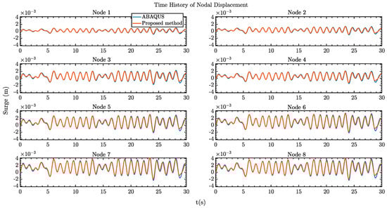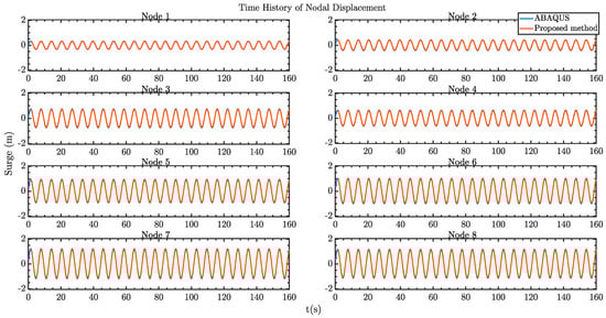 The nodal displacement along the forward legs is presented in Figure 8. The results are shown when the responses reach a steady state for a wave frequency of 0.667 Hz. It can be found that the nodal displacements obtained from the simulations following the proposed framework at eight different locations are consistent with those from the direct dynamic analysis. In general, the difference between the proposed method and the conventional direct FE simulation is found within 2%, demonstrating a very good agreement. From these responses, it can be found that the surge motion in general is dominated by the second mode of the structure. Under the regular wave excitations, the maximum surge motion can be up to 1.5 m. The maximum surge appears at the nodes close to the hull.