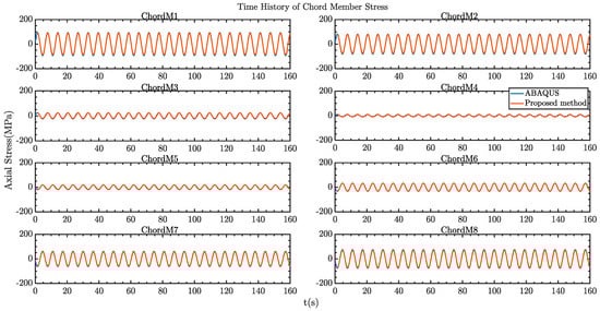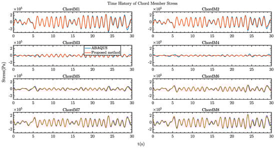 The axial member stresses of the selected bracing members and chord members of the legs are presented in Figure 9 and Figure 10, respectively. The stresses in chord members are around 100 MPa, which is at a reasonable range for the generic SEU design. Again, very good agreement can be seen between the two models. However, some discrepancies on the bracing member stresses between the two models can be observed, which could be related to the slight difference between the mode shapes of the two models as well as the influences from the local hydrodynamic loads acting on the bracing members. Nevertheless, it is worth emphasizing that the proposed method focusses on efficiently predicting global dynamic responses and stresses. Any local structural effects can be catered for using a detailed analysis when necessary.