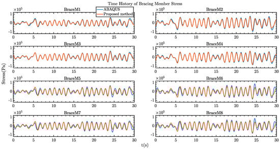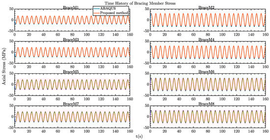 Comparison of the time history of bracing member axial stresses under regular wave excitations.