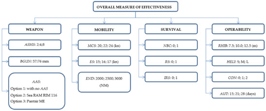 There are two design model attributes i.e., OMOE and the TLCC. The OMOE is the weighted sum formulated from the values of the 13 specific attributes that impact the tactical-technical characteristics of the ship, such as speed, cruising range, weapons, autonomy, and survivability. Specific attributes are divided into four groups: weapon, mobility, survival, and operability. This attribute is obtained by applying the weight coefficients KTK(i) derived by inter-attribute preference using Saaty’s theory [43], and the analytic hierarchy process (AHP). The weight coefficients are based on the interviews with the naval officers in charge (former commanders of patrol vessels of the Croatian navy). The same approach is applied for value functions VFP(i). Figure 1 represents the hierarchical structure of specific attributes, while Table 3 represents the weights of specific attributes.