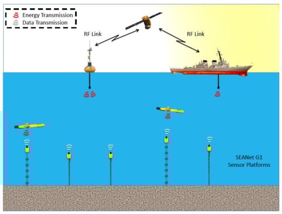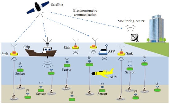 Generally, large water bodies may be divided into small seas and vast oceans, which together cover about 71% of the earth’s surface. Most ocean areas have not been fully explored yet. It is of paramount significance to explore these oceanic areas. In this regard, the IoUT has emerged as a promising technology to support underwater discovery and exploration [1]. The IoUT is considered a remarkable revolution in communication and computing. It is a smart network of underwater objects such as sensor nodes, cluster heads, cameras, autonomous underwater vehicles (AUVs), remotely operated vehicles (ROVs), autonomous surface vehicles (ASVs), buoys, ships, etc. which supports various maritime applications. The IoUT objects are fixed at one position or can move from one position to another to collect information. This information is then transmitted through digitally linked underwater objects, including the gateway or water surface buoys. These smart objects can sense, process, and transmit data to the intended destination. IoUT systems are generally used to measure specific chemical, biological, or physical ocean parameters such as water quality, pH, turbidity, humidity, pressure, and temperature to provide real-time and historical data. These objects can also be used to find hidden treasure, oil and gas spills, minerals, metals, and corals. Moreover, other devices, such as mobile gateways, base stations, satellites, etc., are used to extend the communication range of the IoUT. However, there are several critical concerns regarding the design, development, and implementation of IoUT systems. The major challenges are communication, battery charging, energy storage, reliability, security, mobility, and dynamic node topology. In the last few years, several research studies have been devoted to the IoUT, some of which [2,3,4,5] have reported some of its features. The IoUT has a wide range of applications, including environmental protection, ocean observation, early warning generation, deep-sea exploration, underwater communication, submarine tracking, oil spill detection, search and rescue, marine transportation, naval network surveillance, and tactical surveillance. For these applications, networks of permanent cabled observation systems are being deployed in the ocean. In particular, underwater observatory systems are deployed for long term real-time observation and monitoring of natural phenomena such as offshore seismicity and tsunamis. Similar to wireless networks in terms of their architectural components and applications, these cabled networks can also monitor seabed movements, water circulation, salinity, pH, temperature, etc. However, in this review, we will only focus on wireless networks. Even though there are some similarities between the Internet of Things (IoT) and the IoUT, such as their structure and operations, the latter is facing different technological challenges in terms of communication media, computational restrictions, channel characteristics, channel type, energy resources, etc. The channel characteristics define the technical factors which impact the IoUT, such as node mobility, pressure, turbulence, propagation speed, etc., while channel types represent the type of medium utilized in the IoUT, such as magnetic induction (MI), optical, acoustic, or radio frequency (RF) waves. Figure 1 presents an overview of an IoUT system based on sensor nodes which enable the use of smart applications in a data center via EM or acoustic links.