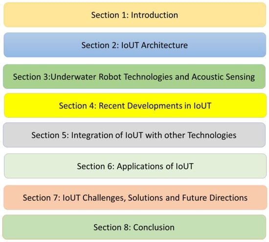 In the literature, several methods have been proposed to explore and monitor the ocean environment, and various testbed designs have been proposed for the successful implementation of the IoUT [13,14,15]. Some projects based on software-defined networks have been implemented [16,17]. In Horizon 2020, scientists developed lightweight, cost-efficient acoustic devices and robotic structures for use with the IoUT [18]. SK Telecom, in collaboration with Hoseo University, South Korea, designed an underwater data transfer system using sound waves [19]. This project was implemented to support a novel IoUT monitoring system. Several naval forces have designed military IoUT (MIoUT) systems to ensure connectivity among AUVs, ships, and submarines. Furthermore, the research team from Senses Lab [20] has focused on IoUT system design. Researchers are also focusing on IoT communication protocols for underwater drones. In [1], the author proposed a novel architecture for the IoUT and discussed its principle and key differences with the IoT. That study also addresses the applications of and challenges facing the IoUT. Furthermore, Argo, a global collaborative project, has been successfully implemented to monitor yearly fluctuations in ocean parameters and climate change [21]. It includes buoys which can measure water pressure, temperature, and conductivity. Celik et al. [22] created a hybrid optoacoustic network intended to overcome underwater networking issues. Several other studies have focused on underwater communication to ensure robustness and enhanced energy efficiency and network capacity. Privacy and security concerns are also critical in IoUT systems. IoUT objects are vulnerable to denial-of-service attacks, wormholes, reconnaissance, Sybil, spoofing, jamming, flooding, and eavesdropping. Yisa et al. [23] briefly discussed security and privacy challenges in UWSN and IoUT. The authors of [24] outlined key enabling technologies, protocols, and localization for UWSNs and the IoUT. In [25], the authors comprehensively discussed the benefits of and challenges facing the IoUT and proposed mitigative solutions. In Table 2, we have summarized different studies on the IoUT. The complete layout of this study is shown in Figure 3.