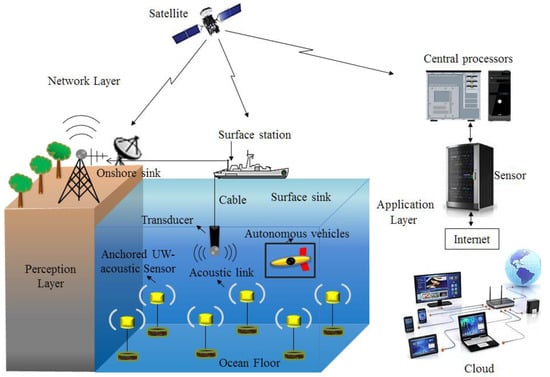 - Sink nodes are located on buoys, ships, satellites, and at on-shore base stations. Generally, IoUT systems are based on several heterogeneous objects; hence, it is very important to introduce a flexible, layered system. Every layer has distinct capabilities in terms of scalability and operation. IoUT architecture is usually based on three layers, as presented in Figure 4.