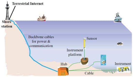 As shown in Figure 7, MARS utilizes a 52 km underwater power and optical fiber to carry electric power and data to a node that is placed 891 m below the Monterey Bay surface which is linked to the shore through a cable [48]. Other nodes can be attached to this main hub, while further experiments can be performed on each node. DONET is a submarine real-time underwater observatory platform intended to observe tsunamis and earthquakes using 20 sets of submarine cabled instruments located 15–20 km apart with five science node interfaces [49]. OCN is based on two underwater observatories, i.e., the NEPTUNE (800 km) and the VENUS (50 km), along with seven shore stations and four community observatories [50]. It aims to offer live stream data from key sites off the coast of British Columbia through the internet to users around the globe. OCN ensures environmental protection through these cabled observatories, big data management, interactive sensors, and remote-control systems.