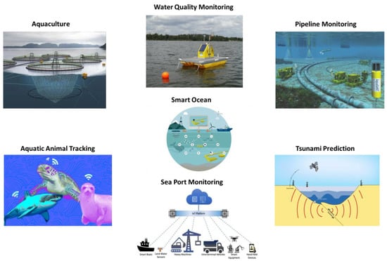 The research community has explored the IoUT in several application scenarios [37,38]. In [5], Kao et al. classified IoUT applications into five different areas, as shown in Figure 9. Moreover, the IoUT has shown its potential in water quality monitoring, remote sensing, pollution detection, oil and gas spill detection, tsunami prediction, aquatic research, and archeological expeditions. Next, we discuss these and other applications in detail.