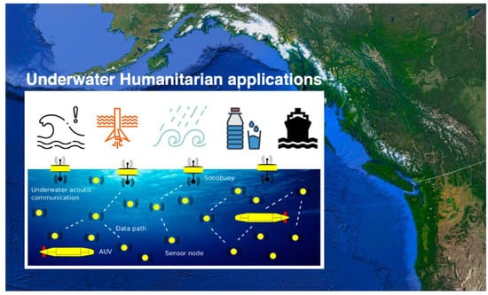 - Coutinho, R.W.; Boukerche, A.; Vieira, L.F.; Loureiro, A.A. Underwater sensor networks for smart disaster management. IEEE Consum. Electron. Mag. 2020, 9, 107–114. [Google Scholar] [CrossRef]