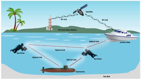 Communication among the underwater objects of the IoUT is difficult because of the ocean’s dynamic, harsh, and turbid nature. The main communication techniques used in the IoUT are MI, acoustics, optical, and RF waves. Generally, acoustic waves are vulnerable to high propagation delay, fading, narrow bandwidths, and high attenuation [33]. The major challenge for acoustic-aided underwater communication is high latency. RF-aided underwater communication is an alternative, as it can withstand turbulence. However, it has a limited distance range for 30–300 Hz frequencies. Using these lower frequencies, it is possible to achieve reliable communication. The conductivity of RF in seawater is very high. Therefore, it is difficult to establish a link via a very high frequency or ultra-high frequency at depths of greater than 10 m. Another critical concern is the large antenna size, leading to high cost and energy consumption.