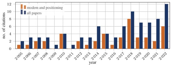Cited scientific papers compared to the publication date. In sum, 86 scientific papers are discussed in this paper. 45 papers cover acoustic modems and positioning systems and 41 papers examine applications and previous surveys.