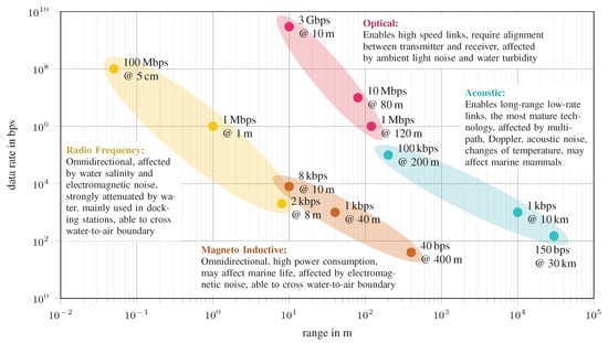 Four underwater wireless communication technologies are available to date, namely underwater electromagnetic radio frequency (RF), magneto-inductive, optical and acoustic communication [25]. Given the high attenuation of electromagnetic signals, especially in salty water, regular WiFi, cellular and satellite technologies cannot be used to perform long range transmissions underwater. Very Low Frequency (VLF) and Extremely Low frequency (ELF) RF antennas were used during the Cold War to enable communication from an over water base station to submarines, transmitting with very low bitrate and with a very high-power consumption. While VLF deployments allow communication up to a depth of 20 m below the sea surface, ELF systems have global coverage but require an antenna with a size of tens of kilometers and to irradiate 2 W of power they require a power consumption of 1 MW [26]. Given that ELF and VLF installations are very expensive, only a few countries in the world had those type of systems: almost all of them are currently dismissed. Conversely, today a few small high-rate (order of a few Mbps) low range (up to 1–2 m) commercial RF modems are used in AUV docking stations and for a few other specific applications [27]. Magneto-inductive modems, instead, can reach a distance up to a few tens of meters and a bitrate of a few kbps [25]: their main advantage is the possibility to cross the water-to-air boundary, but their high transmission power may affect marine life. Able to cover the same distance, but also to provide a higher rate of a few Mbps, optical modems are currently the preferred communication devices for underwater broadband short-range links [28]: while light emitting diodes based transmitters can provide a rate of a few Mbps at a range of tens of meters, laser-based systems can achieve a higher distance and rate, but transmitter and receiver have to be perfectly aligned. Currently, acoustic modems are the only devices able to establish long underwater links, up to a distance of tens of kilometers [3]. Despite their low bitrate imposed by the low bandwidth available in the acoustic channel, they are the mostly used communication technologies, with several industrial and research devices being developed in the last decades: for this reason this paper reviews the state of art of underwater acoustic communication systems. The four aforementioned communication technologies are summarized in Figure 3, where we can clearly observe that optical communication outperforms all other technologies for short range links, while acoustic is the only technology able to support long range communication. Still, the fact that magneto inductive and RF are not affected by turbidity, multipath, sunlight and shipping noise, make them valuable alternatives when the channel conditions are not favorable for acoustic and optical communication.