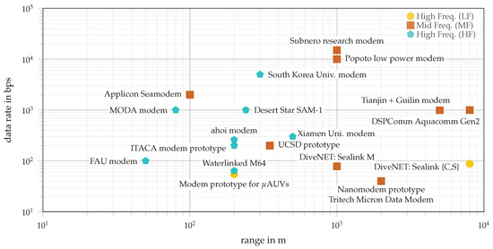 A low-cost modem developed by the Tianjin and the Guilin Universities, China, based on the embedded system STM32H743 that uses single and multi carrier MFSK schemes has been presented in [57]. The modem can achieve a distance of 5 km with a bitrate of 125 bps, and of 2.5 km with a bitrate of 1 kbps, and operates in the 20–30 kHz band.