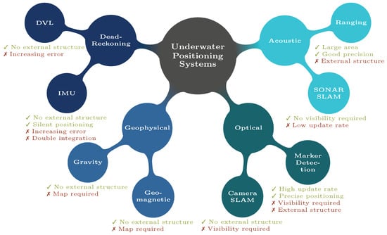 Comparison between different underwater positioning systems based on [22,23,24]. Abbreviations: Doppler velocity log (DVL), inertial measurement unit (IMU), simultaneous location and mapping (SLAM), sound navigation and ranging (SONAR).