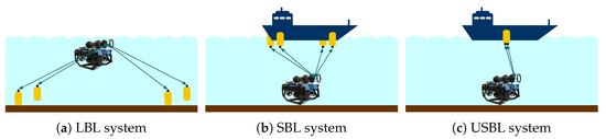 In the following sections, systems based on acoustic range or relative range difference measurements are discussed. In this paper, the reference stations are named anchors and the agent is the target with unknown position. The agent could be a vehicle, submerged equipment, or a sensor node. Typical configurations are shown in Figure 6. In all cases, distance measurements to external reference stations are used to calculate the agent’s position. Different systems can be classified by the anchors’ position. Long baseline (LBL) systems cover a wide area and the anchors are mounted on fixed structures in the underwater environment or under buoys. Short baseline (SBL) systems have smaller distances between anchors, typically they are mounted at the outer edges of a ship hull or under small buoys. In an ultra short baseline (USBL) system, multiple hydrophones (or receivers) are installed in a single device located in a well known position, e.g., under a ship. The typical distances between anchors ranges from 50 m to more than 2000 m for LBL systems and from 20 m to 50 m for SBL systems [68]. Normally, acoustic ranging systems measure the agent’s position in a local coordinate frame: additional GNSS receivers attached to the anchors allows a conversion into global coordinate frames. The distance between anchor and agent can be measured with the time of flight (TOF) or received signal strength (RSS) of the acoustic wave. Due to the strong multipath propagation and acoustic background noise, TOF is more accurate and the preferred option [69].