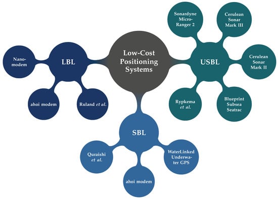 Summary of recent low-cost acoustic positioning systems. Abbreviations: long baseline (LBL), short baseline (SBL), ultra short baseline (USBL). (Ruland et al. [95], Quraishi et al. [92], Rypkema et al. [99]).