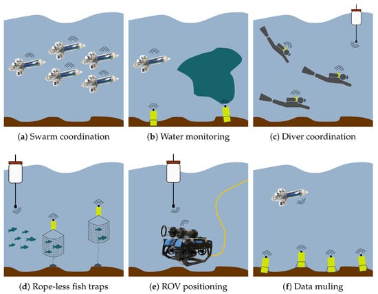 In this section, we both analyze the fact that some well-known but hard to develop applications became now feasible thanks to the availability of low-cost acoustic modems, and new applications that can provide a significant benefit to coastal areas. In the former group we find applications such as rope-less fish traps [103], low-cost ROV positioning [6], and divers mission coordination [56]. In the latter, we can certainly mention micro AUV swarm coordination [104], internal water quality assessment [105], and data muling with low-cost AUVs and ASVs [8].