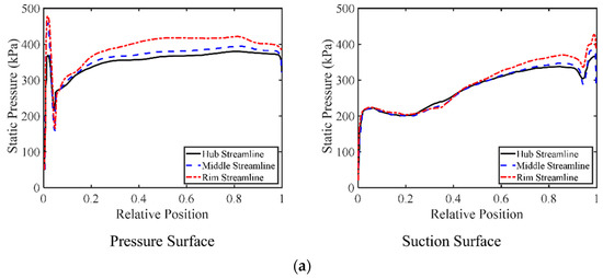 The static pressure data of the three streamlines under each working condition is extracted, respectively. The relative positions of static pressure data points on each streamline are conducted with normalization processing. The position where the relative position of the blade is 0 means the impeller blade inlet, and the position where the relative position of the blade is 1 means the impeller blade outlet. The static pressure distribution of the helico-axial pump blade surface is finally obtained, as shown in Figure 8.