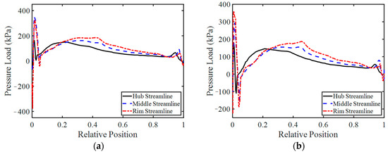 It also can be seen from Figure 9a,b that, under the working condition of a small flow rate, within the range of relative position from 0 to 0.2, the pressure load of the hub streamline reaches the maximum, and the difference between the pressure load values of the middle streamline and the rim streamline are very small. Meanwhile, within the range of relative position of from 0.2 to 1, the pressure load at the rim streamline is the largest, followed by that of the middle streamline, and that of the hub is the minimum, indicating that, under the working condition of small flow rate, the work capacity of the hub within the range of relative position of 0~0.2 is obviously stronger than that of other areas of the impeller and the work capacity from hub to rim within the range of relative position of 0.2~1 gradually increases. With the increase of flow rate, under the working conditions of the designed flow rate and large flow rate, the area with a strong work capacity of the hub gradually expands while the area with a strong work capacity of the rim gradually narrows. Additionally, it can also be seen from Figure 9 that, with the increase in flow rate, the fluctuation of pressure load curves of each streamline gradually increases, and its peak value gradually deviates towards the outlet. It can be known from the literature [4] that the blade load distribution is relative to the relative velocity. The fluctuation of load curves will lead to fluctuation of relative velocity inside the impeller and the flow inside the impeller becomes more turbulent. Contrarily, the more uniform the velocity distribution inside the impeller, the more stable the internal flow. The maximum load value of the blade shall be optimal in the middle of the impeller with a slight inclination to the inlet. As the maximum load moves to the outlet, pump performance begins to degrade.